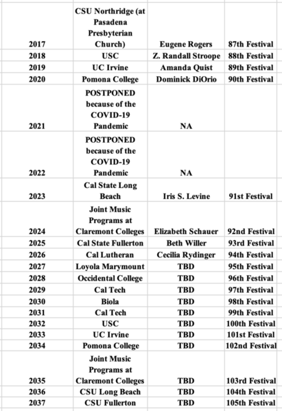 Today the Pacific Southwest Intercollegiate Choral Association has thirteen member institutions. Each school is usually represented by its largest mixed voice concert choir. The host school's director serves as the association president and selects a nationally recognized choral musician to serve as the festival clinician. An executive secretary monitors association business and financial matters. The directors hold an annual luncheon meeting to discuss both choral matters and association business. Following the meeting, an afternoon clinic is presented by the guest adjudicator. Each choir may send an octet to that clinic. Warm-ups for the festival commence at 4 p.m. The festival starts at 6 p.m., with the order of each school's performance chosen by lot. After the cheers and groans from this process have died down, the festival begins, the tradition continues. In the words of the old college song, "Gaudeamus Igitur":